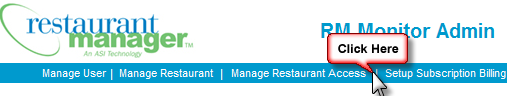 RM Monitor can be programmed to restrict/allow users access to one, several, or all locations within a chain. For example, if you have several locations in a chain, you may want the regional managers to have access for data belonging to all stores in the chain but want to restrict the store manager to access only the data for their store. By default, any new user will have access to all locations until programmed otherwise. The “Manage Restaurant Access” function is typically used when for chains with multiple locations. Single store users will have little need for this function. Access and restrictions to restaurants are programmed under the Manage Restaurant Access tab in the RM Monitor Admin page.