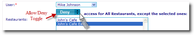 Allow/deny- The option will toggle allowing you to deny or allow access to restaurants. Choosing the toggle option largely depends on the how many stores you have in the chain. If you have several stores in the chain and want to restrict a user access to a single location, you would want to select the deny option to restrict access for all restaurants except for the stores selected in the “Restaurants “section below. Conversely, it will be easier to allow access to all restaurants except the selected ones (restaurant section) if you want to grant access to multiple stores with the exception of a few.