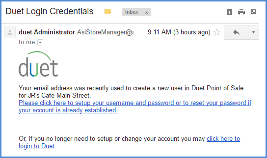 Check your email, the password reset link will arrive generally in less than 2 minutes. Check your spam/junk folder if you do not see it in your Inbox. The email you receive will be similar to the one pictured after successfully registering for Duet.