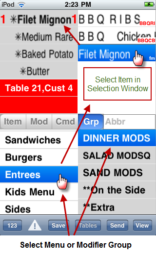 With the increased popularity and use of cell phone texting, your staff may feel more comfortable with an on board keyboard to input information. The Write-On for iPod Touch is ideal for this method. Using this method, the user will type abbreviations for menu items and then select the matching items in the Item Selection window.