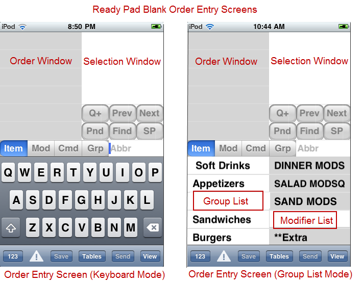 The right window is known as the Selection Window. In general, the selection window will display possible selections for the active mode including menu or modifier items, commands, and menu groups. For example, in item mode, as you write letters in the Item Input Area, all items that match the entered abbreviation will appear in this window automatically. To select an item to go onto the order you simply touch it. Similarly, if in Modifier mode, the selection window will show modifiers. Abbreviations will appear to the right of both item and commands listed in the selection window.