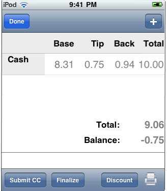 The Write-On for iPod touch provides full settlement functionality, including all pay types (except when hardware limited, as with Debitek), Voids, Credit Cards, payment modification, printing of receipts, and finalization. You can access payment types using the [+] button in the upper right corner of the screen. The main body of the screen will display all payment types applied to the order. The toolbar at the bottom contains function buttons that will submit credit cards, finalize transaction, and apply discount (will be implemented on future release). More detailed information on the settlement process can be found in the section: Settling an Order.
