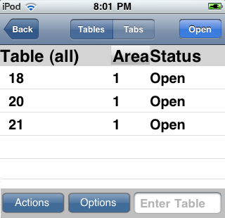 The Tab Selection Screen is similar to the Table Selection screen with the exception of one button under the Actions button. Under the Actions options list there is a button named "Swipe". This function allows you to swipe a credit card to start a tab.