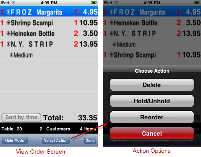 You must first select the menu items on the screen before pressing the [Select Action] button. Both the Delete and Hold/Unhold options are available commands in the Order Entry screen. However, the advantage to using the same function in the View Order screen is that you can affect multiple items at the same where the same commands may only be performed on one item at a time in the Order Entry screen.