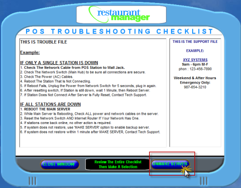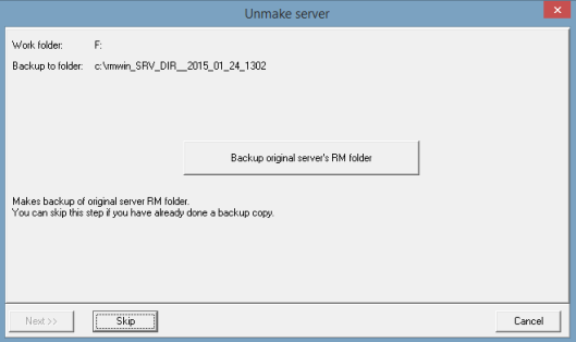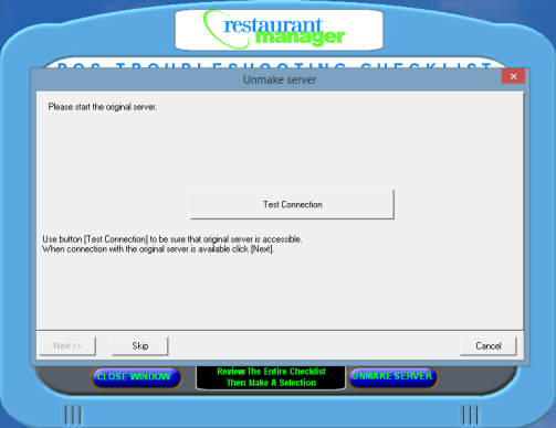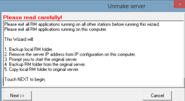 When the primary server (rmserver) is operational again, the original configuration will need to be restored. This is done by the “Unmake Server” option. Usually this operation is done by the dealer because it requires more user input and is more involved, but with adequate training most anyone can do it.