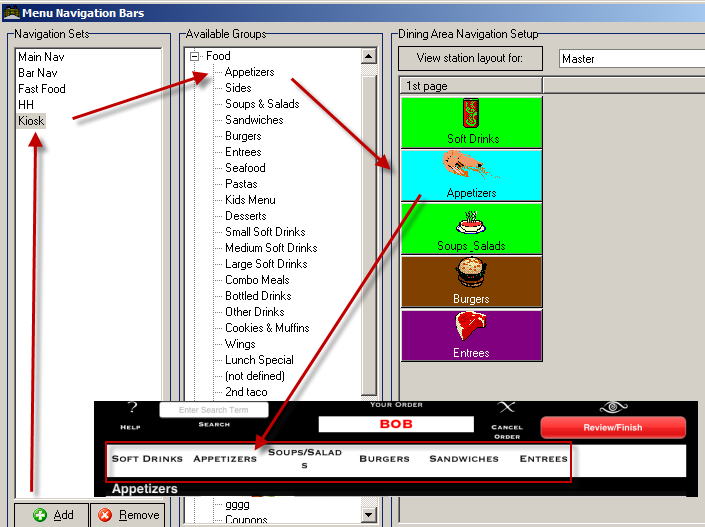 Similar to the RM Handheld, menu items displayed on the kiosk as rows are configured using menu navigation sets. You need to create a menu navigation bar that will correspond to the menu bar at the top of RMKiosk. Menu Navigation sets are configured in the RMWin Back Office Module à Setup à Menu Navigation. Click "Add" to add a navigation set and use the menu tree under the available Groups column drag menu groups to the buttons to the right. Use the "Remove" button to delete the last button in the set.
