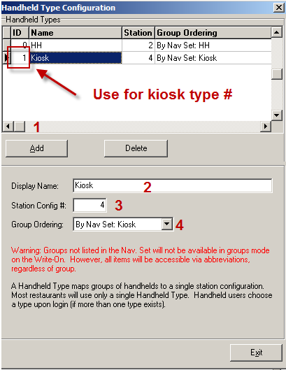 Rm Kiosk, like the RM Handheld needs to be configured to use a specific Station Configuration number and Navigation Bar by using a RM Handheld/Kiosk Type. Defining a kiosk type is done within the ASI SOAP Server Control Panel using the Handheld Type Configuration Setup Form. Only one kiosk type needs to be defined and be be used on all kiosks. Additional kiosks types only need to be created if you are routing prep order tickets to different prep printers or wish to offer different menu selections on each kiosk (using separate navigation sets). The form is accessed by opening rmservicesCPL (.exe), click "Setup" and then "RM Handheld/RMKiosk Types". Use the following steps to configure a kiosk type: