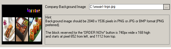 Company Background Image - Use this field to add a logo to the default screen on RMKiosk. Use the ellipses button to browse for an image. Images can be PNG, JPG, or Bitmap format. The background image should be 2048 X 1536 pixels.