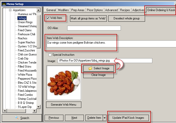 Be sure to click ‘Update iPad Kiosk Images’ when you have finished defining your menu or any time after you add new items and images. Item descriptions and images must be the same if using Online Ordering.