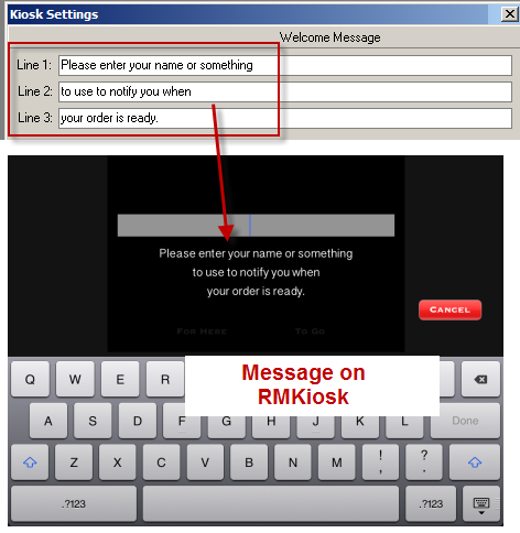 Welcome Message- use the three lines of this section to enter a message that will appear on the RMKiosk after the customer presses the "Order Now" button. The welcome message should give the end user a hint on how to proceed with the order.